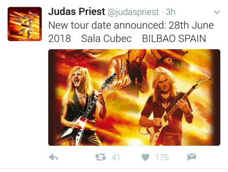 Judas Priest lo acaban de anunciar en su página y redes sociales. Aún no se conocen los detalles de venta de entradas, así que seguiremos informando cuando se conozcan más detalles. La fecha será el 28 de junio de 2018 y, el recinto, la sala Cubec. La promotora aún no ha confirmado el evento, pero esta se convierte en la tercera fecha de la mítica banda en nuestro país, junto a las del 30 de junio en el Download Festival Madrid y 5 de julio en el Rock Fest Barcelona.
