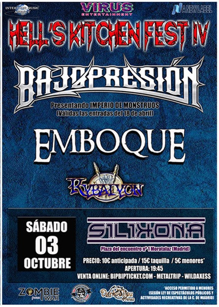 La cuarta edición del festival Hell’s Kitchen previsto inicialmente para el 18 de abril ya tiene nueva fecha. El sábado 3 de octubre en la Sala Silikona de Madrid tendrá lugar esta nueva entrega con Bajopresión como nuevo cabeza de cartel tras la caída del cartel de los renacidos Sphinx, debido al accidente de su bajista Pepe Pineda.