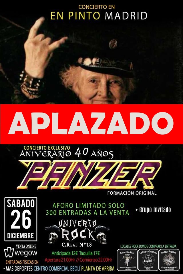 El concierto «40º aniversario» que la formación original de Panzer iba a realizar el sábado 26 de diciembre en la Sala Universo Rock de Pinto (Madrid), se ha visto aplazado por un accidente doméstico sufrido por el batería Rafael Ramos.