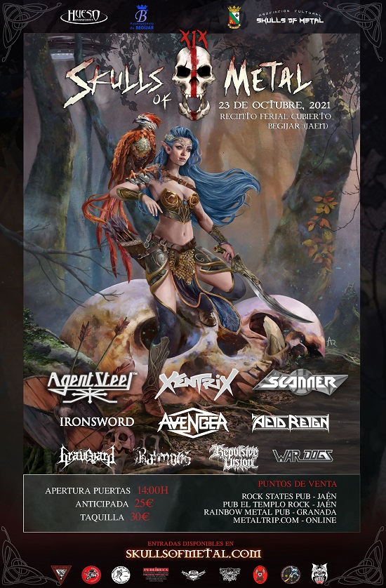 El cartel realizado a mano por Anna Sinthetic presenta una nutrida representación internacional con grandes nombres del thrash como los californianos Agent Steel y las bandas británicas Xentrix, Acid Reign y Avenger. El death metal estará presente con los también británicos Repulse Vision y el heavy metal más clásico con los alemanes Scanner y los portugueses Ironsword. Completan el cartel las bandas nacionales War Dogs, Graveyard y Balmog. El precio de la entrada en venta anticipada es de 25 euros a través del siguiente enlace: https://entradas.metaltrip.com/events/skulls-of-metal-fest-2021