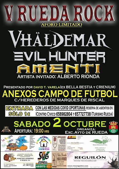 Con el simbólico precio de 1 euro, destinado a una ONG, tendra lugar el sábado 2 de octubre su quinta edición con todas las medidas sanitarias vigentes en el momento. Al aire libre y con un aforo de 300 espectadores sentados en la zona habilitada en los anexos del campo de futbol de la localidad, los vizkaínos Vhäldemar presentarán su último disco «Straight To Hell» publicado el pasado año. Por su parte Evil Hunter, formación liderada por el guitarrista José Rubio, presentará su segundo disco «Lockdown” que verá la luz el 8 de octubre y la formación vallisoletana Amenti acentuará su conexión con Asturias al volver a juntar en un escenario a su vocalista Juan Lozano con Alberto Rionda, en un concierto especial en el que además de presentar su ópera prima «Fuerza Vital» interpretarán varios temas de «La Llama Eterna«, el primer álbum de Avalanch.