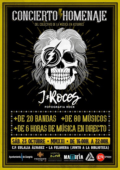 Como reza el cartel, más de 20 bandas y de 80 músicos en 6 horas de música, ese día no hay estilos, solamente un objetivo común mostrar el respeto, admiración y nostalgia por la figura de José González Roces, el fotógrafo de la música asturiana.