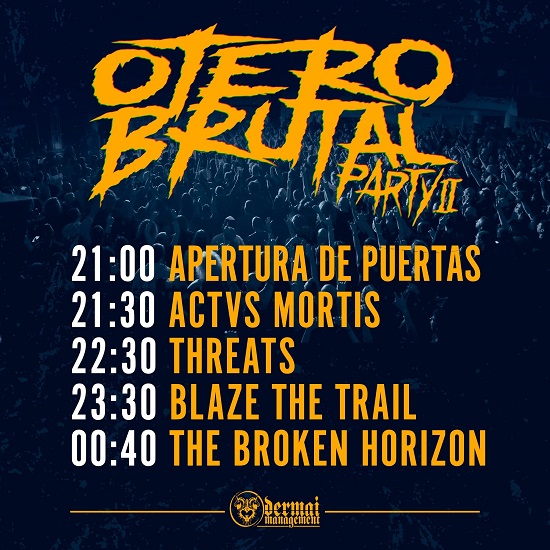 Tras el éxito de la primera entrega de la Otero Brutal Party la asociación cultural Oviedo Crew y Dermai Management & Booking repiten fórmula este sábado 23 de abril con The Broken Horizon, Blaze The Trail, Threats y los mierenses Actvs Mortis como protagonistas. Estos son los horarios oficiales:
