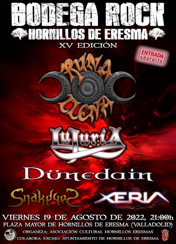 El festival Bodega Rock que tendrá lugar en su ubicación habitual, la plaza mayor de la localidad vallisoletana Hornillos de Eresma el viernes 19 de agosto, desvela el cartel final de la que será su esperada 15º edición. Los protagonistas del retorno serán Runa Llena, Lujuria, Dünedain, Snakeyes y Xeria.