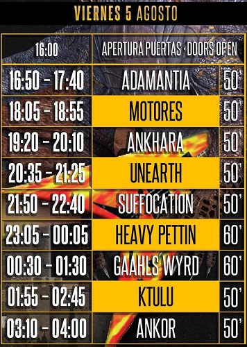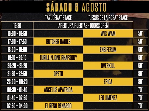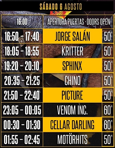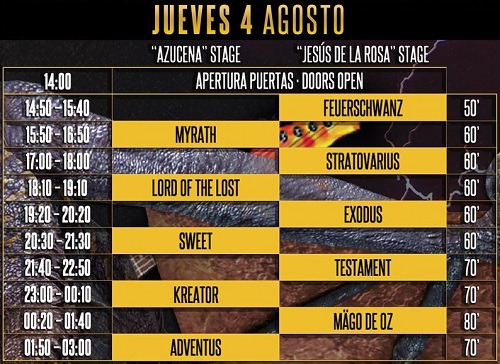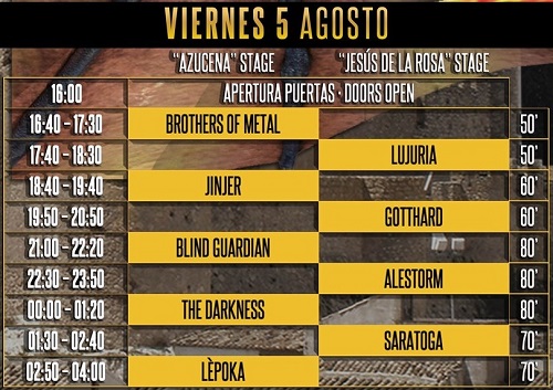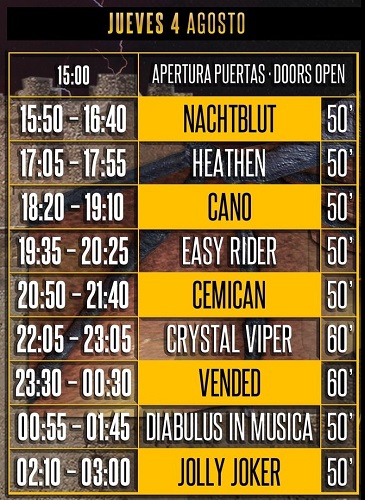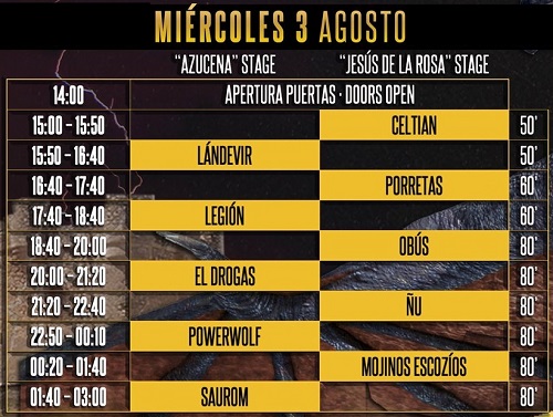 La organización del festival Leyendas del Rock hace públicos los horarios de todas las actuaciones. El festival arrancará el miércoles 3 de agosto con las siguientes actuaciones y reparto de tiempos: