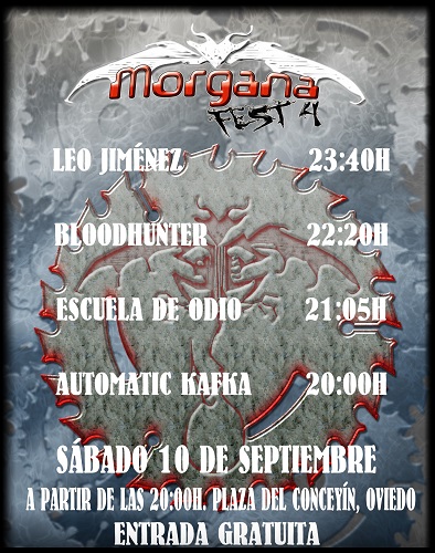 El retorno del festival ovetense Morgana Fest presenta sus horarios oficiales. Impulsado por el consistorio de la capital asturiana y el equipo capitaneado carismático locutor radiofónico Fredy Torres, el evento que mantiene su carácter gratuito tendrá lugar el sábado 10 de septiembre en su habitual ubicación, la plaza del conceyín en el barrio de la Corredoria con Leo Jiménez, Bloodhunter, Escuela De Odio y Automatic Kafka como protagonistas.