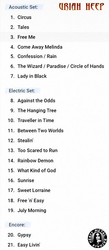 Tras este memorable inicio completarán el espectáculo en formato eléctrico. Será el momento de disfrutar de himnos atemporales como «Traveller In Time«, «Stealin’«, «Too Scared To Run«, «Return To Fantasy» o «Bird Of Prey«. El colofón, como no puede ser de otra manera, estará reservado para «Gypsy» y «Easy Livin’«. A continuación podemos comprobar el repertorio «base» de la gira hasta el momento.