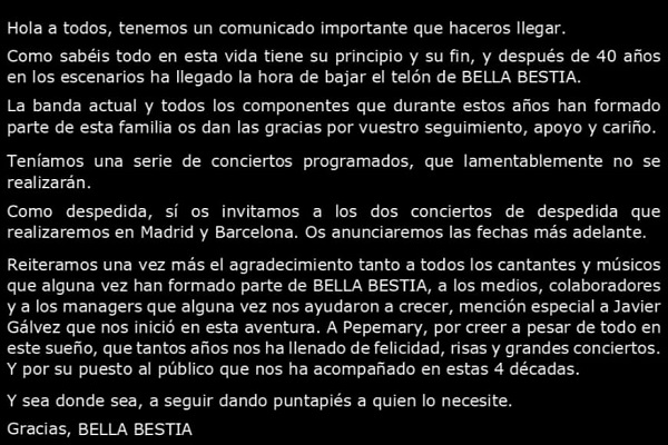 Los veteranos Bella Bestia, a través del siguiente comunicado, anuncian la disolución de la formación y despedida definitiva tras 40 años de trayectoria.