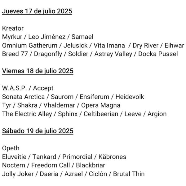 A las ya anunciadas de Kreator, W.A.S.P., Accept, Eluveitie o Sonata Arctica, este nuevo avance también incluye a los finlandeses Omnium Gatherum y los alemanes Freedom Call y por parte nacional a Leo Jiménez, Vita Imana o Vhäldemar.