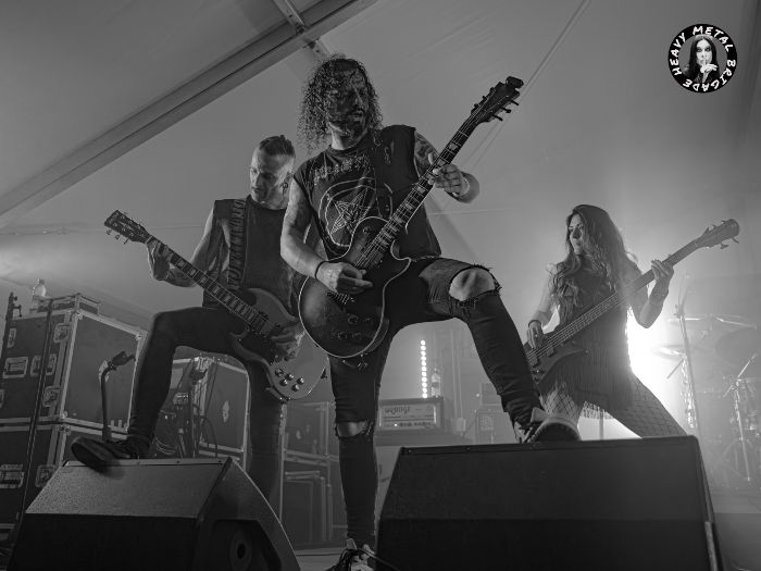 Y que como viene siendo habitual arranca desde la intro para enlazar con “Your Doom”. Esos coros iniciales de Abel, tan esquivos otras veces, sonaron claros y diáfanos en Vidiago. Una vez más el sonido iba a ser redondo, si bien pequeños acoples enturbiaron el correcto desarrollo de los asturianos. Laura, su micrófono esta vez con cable y ya es raro, volvió a mostrar ese carácter verdaderamente volcánico que la caracteriza. Luciendo el mismo emblema con el que terminara hace unas semanas en Gijón (cuánta razón), comandó al quinteto con pulso de veterana. Abel nos mandaría al suelo. Que tiene sentido pues la banda enfrentó luego “Break Out From Hell”.