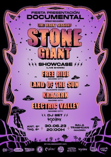 El próximo viernes 30 de junio a partir de las 20 horas tendrá lugar en el Trashcan Music Clubde Madrid la proyección del documental “Stone Giant: Live Sessions”, compuesto por actuaciones y entrevistas a las bandas Free Ride(Madrid), Land Of The Sun(Alicante), KrazarK(Madrid) y Electric Valley(Madrid), donde comentan su experiencia y reflexiones sobre distintos aspectos de la escena stoner estatal.