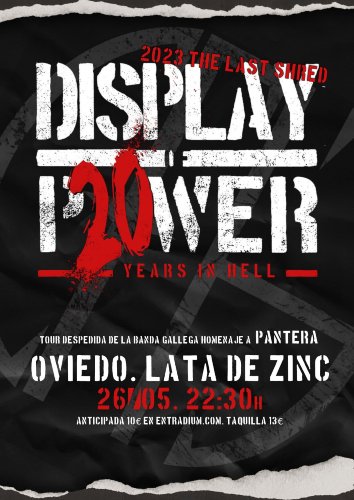 El veterano tributo a Pantera Display Of Power anuncia la batería de fechas que formarán su gira de despedida tras más de 20 años de trayectoria. Bajo el nombre de «The Last Shred tour 2023» la formación gallega se despedirá de los escenarios tras la vuelta a los escenarios de dos de sus miembros de la banda original, por lo que han decidido echarse a un lado y pasarles el testigo.