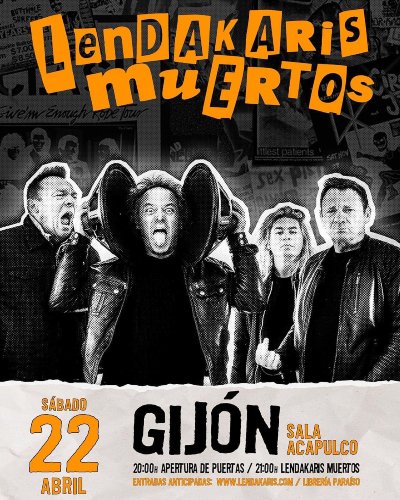 Cerramos el repaso al sábado con los punk rockeros navarros Lendakaris Muertos que presentarán en Gijón su nueva formación tras la llegada de Ivan Karmona como nuevo guitarra. Entrada anticipada 15€, disponible online a través del siguiente enlace: https://acortar.link/9xruBn