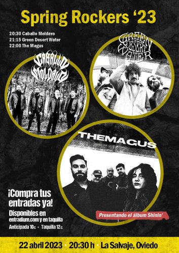 Abrirá la jornada el «Spring Rockers ’23» a las 20:30 horas en la ovetense La Salvaje con los hiperactivos Caballo Moldavo, Green Desert Water en uno de sus últimos conciertos de la gira promocional de «Black Harvest» puesto que ya se encuentran inmersos en la confección de su próximo disco y la presentación del su álbum debut por The Magus. Entrada anticipada 10€, en taquilla 12€ y online a través del siguiente enlace a Entradium: https://entradium.com/es/events/spring-rockers-23-brama-green-desert-water-the-magus