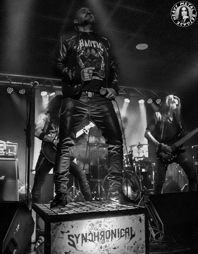 Apenas pasadas las 21:,00 abren Synchronical y lo primero que llama la atención es su puesta en escena con torres de leds, un par de podios al borde del foso y el gran telón de fondo. Inusual para una banda telonera. Eficaz a la hora de potenciar a un quinteto que acudía a tierras asturianas no sin algún pequeño percance en la figura de Jesús Mateos, cantante, aquejado ese mismo día de una engorrosa parálisis facial.