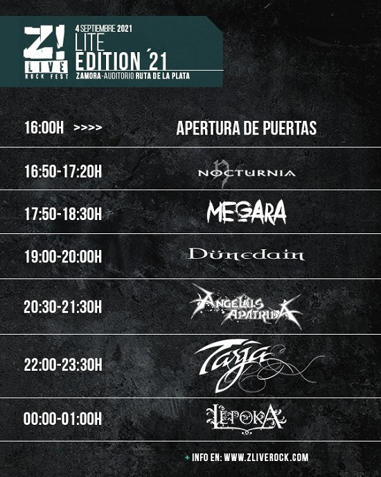 El festival Z! Livedesvela los horarios oficiales para su edición «Lite«, que se celebrará en el habitual Auditorio Ruta de la Plata de Zamora el próximo 4 de septiembre con Nocturnia, Megara, Dünedain, Angelus Apatrida, Tarja Turunen y Lépoka como protagonistas.