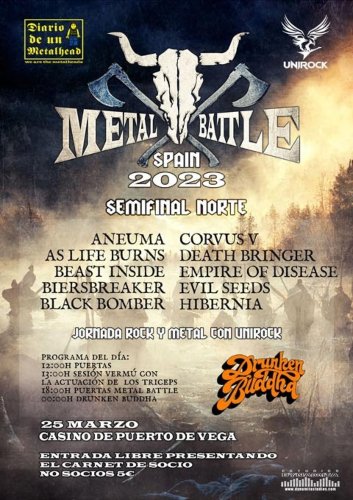 En colaboración con la Asociación Unirock la organización desvela los horarios oficiales de un evento protagonizado por las siguientes bandas participantes, ANEUMA (Asturias), AS LIFE BURNS (Asturias), BEAST INSIDE (Asturias), BIERSBREAKER (Euskadi), BLACK BOMBER (Castilla y León), CORVUS V (Castilla y León), DEATH BRINGER (Castilla y León), EMPIRE OF DISEASE (Euskadi), EVIL SEEDS (Euskadi) e HIBERNIA (Cantabria). El orden de actuación se dirimirá mediante un sorteo previo a la celebración del concurso tal y como dictan las normas internacionales del mismo.