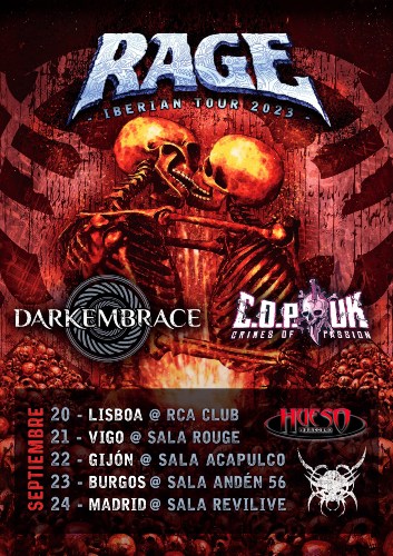 Vía Hueso Producciones la legendaria formación alemana Rageregresará a nuestros escenarios en el mes de septiembre. Presentarán su nuevo trabajo de estudio, el 25º de su trayectoria, un EP de 6 temas bajo el título «Spreading The Plague» (reseña aquí) acompañados por los gallegos Dark Embrace y los británicos Crimes Of Passion también conocidos como C.O.P. UK.