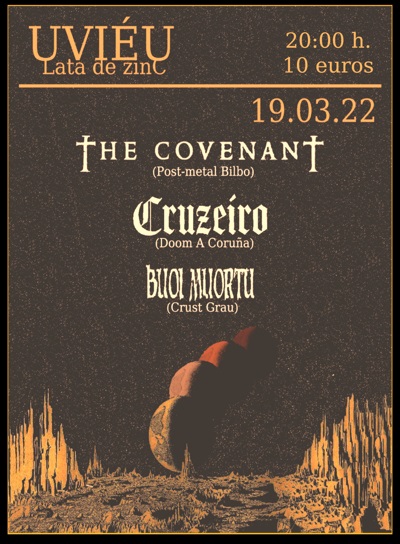 El sábado 19 de marzo en la ovetense Lata De Zinc tendrá lugar el aquelarre protagonizado por CRUZEIRO (Doom Metal desde A Coruña), THE COVENANT (Post Metal Doom desde Bilbao) y el combo sludge astur BUOI MUORTU.