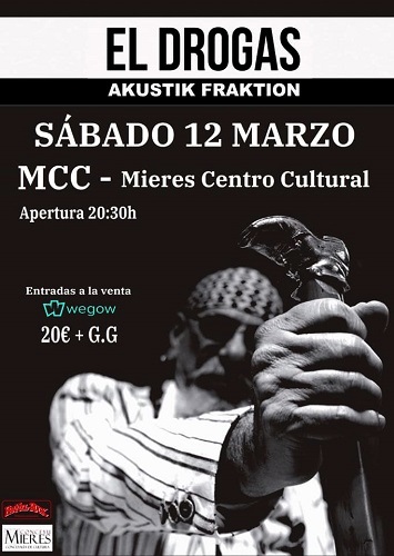 Enrique Villarreal (El Drogas) no necesita presentación, el otrora bajista y voz de Barricada, se reinventa en su carrera en solitario explorando nuevos sonidos y facetas. Tras el lanzamiento de un nuevo libro de poemas y otro disco de carácter muy personal, arrancaba en septiembre del pasado año una extensa gira acústica con parada el próximo sábado 12 de marzo en el Centro Cultural Mieres.