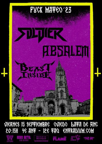 Comenzaron las fiestas de San Mateo en la capital asturiana con una cita que no nos podíamos perder. Y no, no nos referimos a la de cierta defraudadora fiscal que congregó a miles de personas en el centro, colapsando calles y dejando constancia una vez más de que la caspa siempre tiene un principio pero nunca un final. Nacía el Fuck Mateo con ánimo de contrarrestar a tanto muermo, congregando en la presente edición en el Chigre Cultural Lata de Zinc a las bandas Beast Inside, Absalem y Soldier. Allí que nos fuimos con las baterías bien cargadas. Literal y metafóricamente hablando.