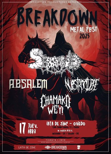De la mano de Breakdown Productions nace un nuevo festival en Asturias con el metal extremo por bandera. Una primera entrega que arrancará el jueves 17 de abril en formato sala, la ovetense Lata De Zinc, con una banda internacional, el divertido combo death/grind portuguésSerrabulho dos estatales Absalem y Nuestroctubre y una asturiana, Chamako Wey.