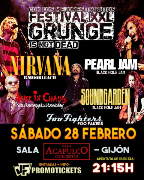 Noche diferente a lo que estamos acostumbrados en H.M.B. la que disfrutamos el pasado sábado 28 de febrero. El itinerante Festival XXL Grunge Is Not Dead, orientado al recuerdo de las bandas más icónicas del grunge como Nirvana, Pearl Jam, Soundgarden, Alice In Chains y la licencia de incluir a los postreros Foo Fighters, se acercaba a la Acapulco de Gijón. Así que apostamos por palpar de primera mano la respuesta que ofrece el público a los eventos protagonizados por las habitualmente denostadas bandas tributo. No es la primera vez que tocamos el tema en la web, por esta página han pasado Ritual, Kiss Experience o Mártires del Rock & Roll en un contexto completamente diferente. Era el momento de captar hasta donde puede llegar un festival de estas características en una de las salas más activas de la región, y comparar su poder de convocatoria respecto a nombres del calibre de Vandenberg, Tim «Ripper» Owens o bandas de calado en la escena asturiana.