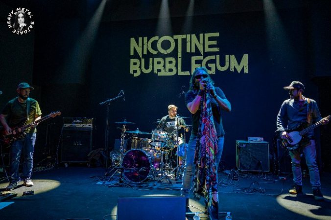 El sonido se fue afinando y la banda dio una buena versión en cortes como “Youth Leisure”, que desde su arranque calmado y melódico transitó hacia un final con Nicotine derrochando nervio y pegada. Me llamó la atención el solo lleno de efectos en “Palindrome”, quizá porque me recordó a las luminarias progresivas Tool. Si tal y como Luismi dijo que llevaban tiempo sin tocarla, lo cierto es que no se notó. De hecho me atrevería a decir que fue de los cortes con más gancho del set. El propio vocalista introdujo entonces “123” sin olvidar mención a Gin Barberia (Absalem), quien le acompaña al micro en la versión de estudio. “Ella no ha podido venir, trataré de hacerlo lo mejor que pueda pero la voz es la que tengo” exclamó irónico. Estupendo ese aire más atmosférico del puente y un Grigera que brilló a las seis cuerdas. Sus riffs siempre tienen personalidad. Sus solos se llenan de efectos. Y, por ahí, la alternativa propuesta del cuarteto brilla en consecuencia. Tras el pequeño reconocimiento a Sergio Saavedra, infatigable técnico de sonido de la sala, llegó el momento de echar el cierre con “War”. Aquí la banda dio su nota más descarnada. Esta vino a contrastar con la mayor sobriedad del solo. Pero con la base rítmica desbocada al final y Luismi desgarrando el grito antibelicista del epílogo, Nicotine Bubblegum terminaron por cumplir en la siempre ingrata tarea de romper el hielo.