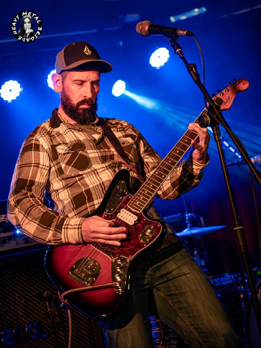 Para nosotros, el de Bellako era un concierto un tanto a la expectativa. Siempre nos puede la curiosidad y en la jornada del viernes, un saludo a César “Lagarto” de Brutalfly, nos habían hablado solo cosas buenas del quinteto radicado en Mataró. De entrada nos agradó su puesta en escena. El telón de fondo pero sobre todo que el escenario, ahora huérfano de monitores, ofreciera un aspecto lo más diáfano posible. Incluso las banderas que cubrían los amplis daban su toque especial.