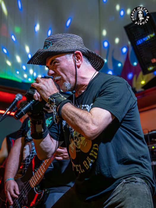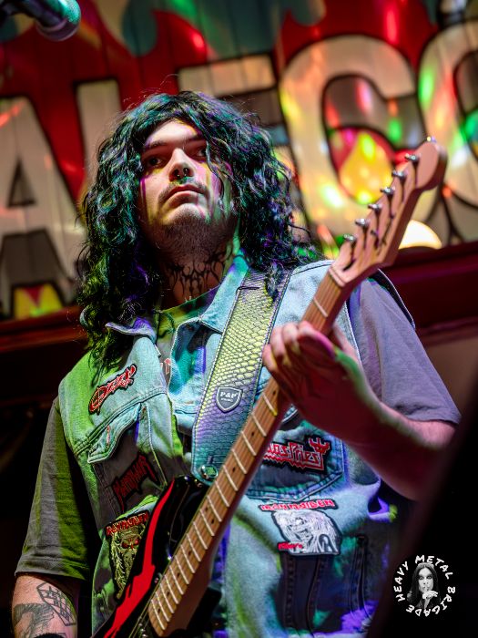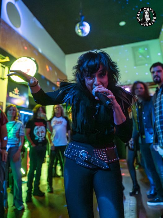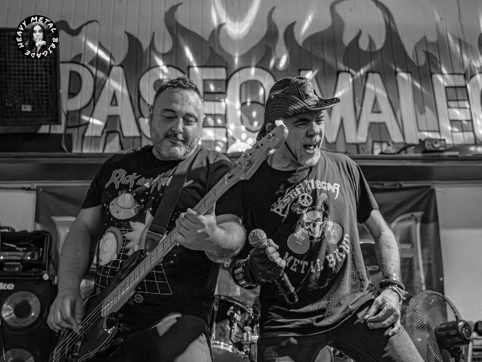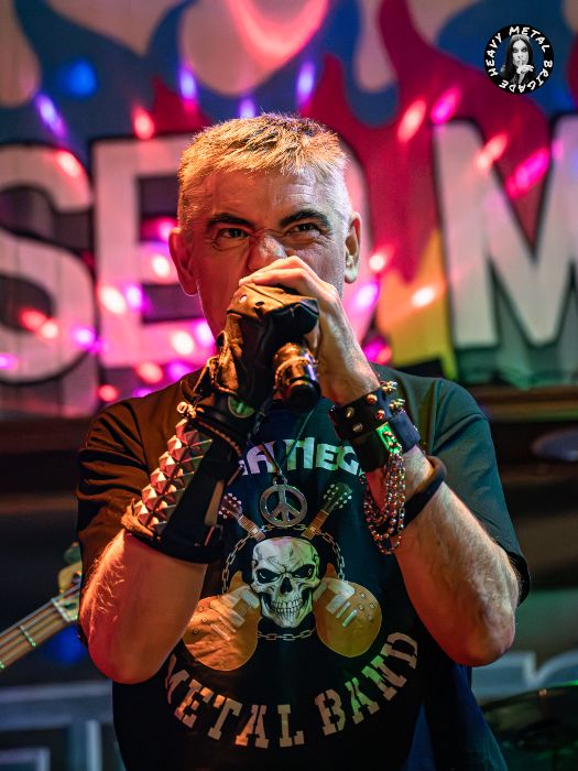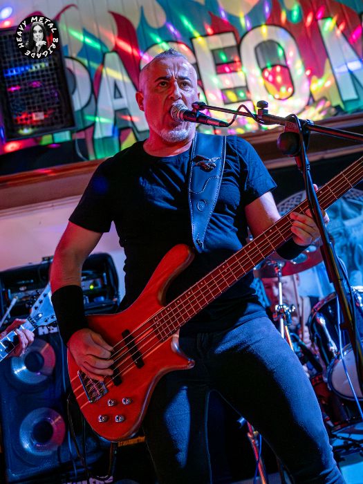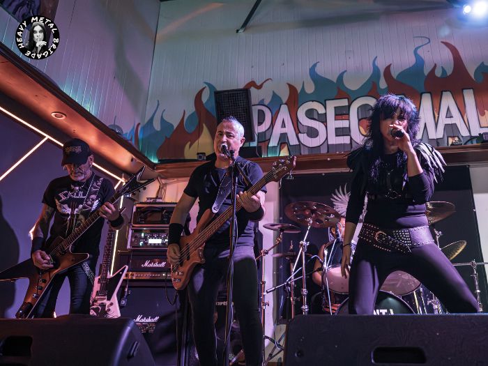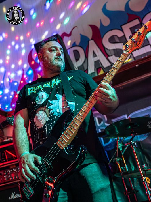 De entrada me llama la atención no tanto el pequeño telón de fondo con el logo del grupo sino las letras que adornan los distintos pies de micro. “B.D.S.M.”, claro. Sería precisamente ese pequeño pildorazo que abre su nuevo álbum el encargado de iniciar una descarga más de los chicos de cuero. Ya de primeras la banda está sonando más sucia que de costumbre. Un arranque a pijo sacao que decía aquél. “Midlife Crisis”, que había estrenado videoclip apenas horas antes, arrancó buenos coros de los Leather Sex (guitarra), Latin Lover (bajo) y Dirty Duke (guitarra), amén todo el feeling posible. A término Leather Rose mandaría un agradecimiento al personal de la Residencia de Ancianos Verdeja (Trasona, Asturias) primero, nos instruiría sobre el sencillo coro de “Crush On You” después. Huelga decir que la gente se lo aprendió enseguida.