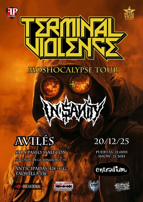 El próximo 20 de diciembre el avilesino Paseo Malecón acogerá la parada en Asturias de Terminal Violence, una de las grandes referencias en la nueva oleada de bandas estatales de thrash metal. Inmersos en la gira “Moshocalypse Tour”, presentarán su último álbum hasta la fecha «Moshocalypse» editado en noviembre del pasado 2024. La parada contará con la formación localIn-Sanity como invitados, que regresan a la sala apenas 15 días después de compartir escenario con Javi «Paxta» Navarro.