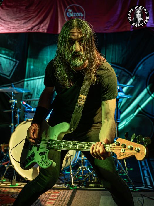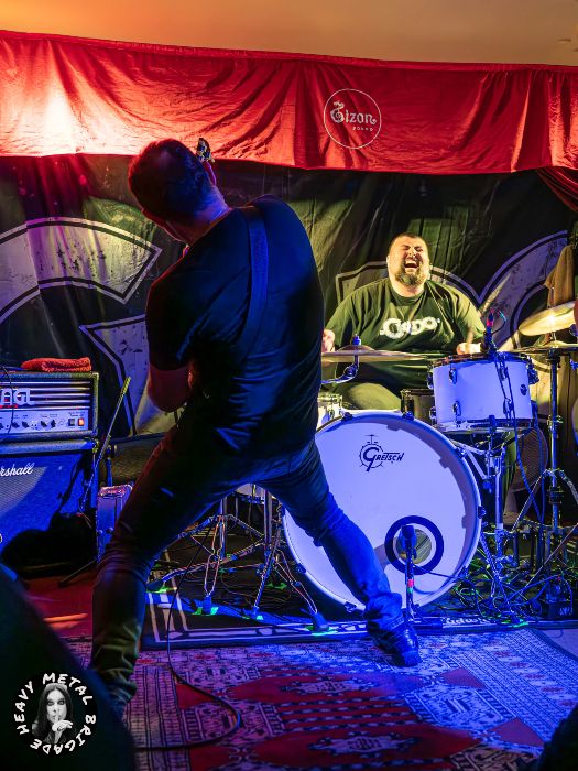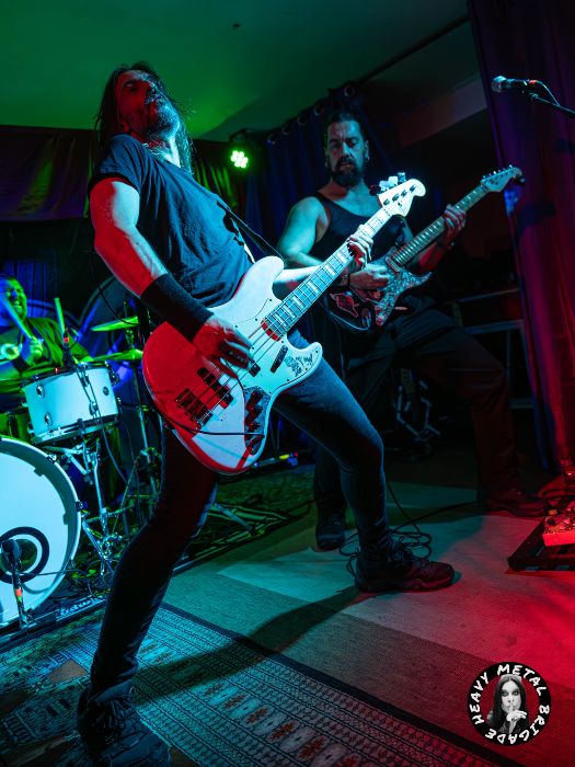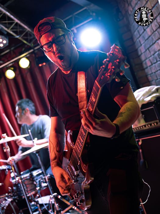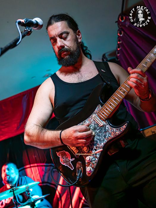 Por ahí la banda fue construyendo un set diverso, cayendo a veces en una calma sin mojigaterías y, ya digo, adquiriendo un mayor peso en su traslación al directo. “Clase Obrera” de hecho nos devuelve a los Karolina Reaper más vibrantes. El riff aquí ni podría ser más elemental ni tampoco tener más gancho. Mike, pie al wah, dejó otro buen solo de guitarra. Entonces y de boca de José Morán, supimos que llegaba “la hora del recreo”, que se tradujo un pequeño set de versiones, adaptadas al particular sonido Reaper, siempre con Guillermo llevando la voz cantante, y por el que transitan porciones de “Iron Man” (Black Sabbath), “Whole Lotta Love” (Led Zeppelin), “Blitzkrieg Bop” (Ramones) y “Killing In The Name” (R.A.T.M.). Casualidades de la vida, Fer Espina& The Riders ya interpretaron esta última cuando pisaron esta misma sala con el equipo de Heavy Metal Brigade dando fe allá por 2023 (crónica).