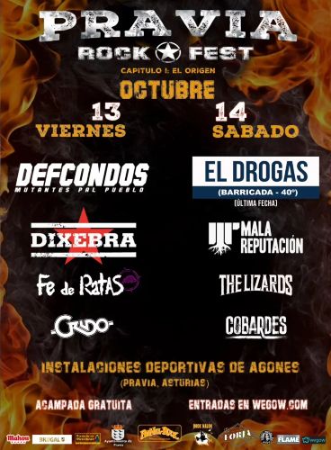 El festival asturiano Pravia Rock Fest que se celebrará los días 13 y 14 de octubre en las instalaciones deportivas de Agones (Pravia) con Def Con Dos, El Drogas en la que será la última fecha de la gira 40º aniversario de Barricada, Dixebra, Mala Reputación, Fe De Ratas, The Lizards, Crudo y Cobardes como protagonistas, desvela el reparto de tiempo sobre el escenario.