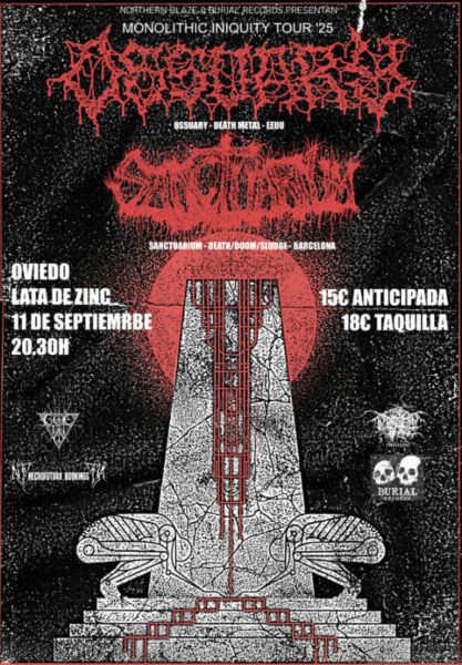 Bajo el sobrenombre de «MONOLITHIC INIQUITY» ambas formaciones se encuentran girando por España y Europa con paradas en Portugal, Francia, Belgica y Paises Bajos. Los catalanes Sanctuarum por su parte llegarán a Oviedo para presentar su segundo disco «Melted And Decomposed» editado el pasado año a través de Me Saco Un Ojo Records y BlackSeed Productions. Doom, sludge y death metal tamizados para dar lugar a una mezcla abrasiva y abismal.