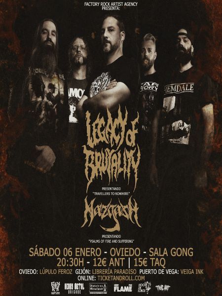 Noche de presentaciones, por parte de Legacy Of Brutality la de su nuevo álbum de estudio «Travellers To Nowhere» en Oviedo y por la de los gijoneses Nazgash de su ópera prima «Psalms Of Fire And Suffering» editada el pasado mes de octubre. Entradas físicas 12€ disponibles en El Lúpulo Feroz (Oviedo), Librería Paradiso (Gijón) y Veiga Ink (Puerto De Vega). Entradas online a través del siguiente enlace: