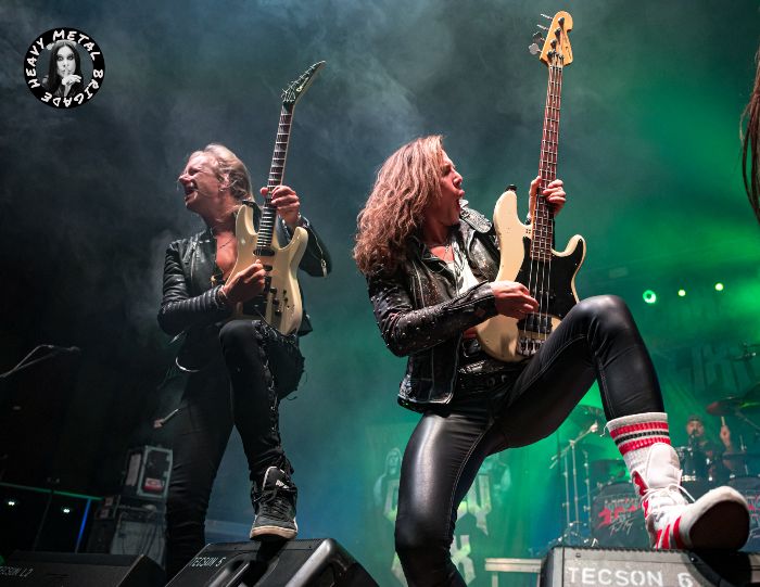 Ventura abandonó entonces su Les Paul para calzarse una llamativa Flying V blanquinegra con la que enfrentaría (casi) todo el tramo final. En un pequeño speech Manuel Martínez recordó cuando la banda recogió sendos premios de la música por el álbum “Aixa” y uno de sus cortes, no otro que el dedicado a su ciudad natal, “Córdoba”. Ni que decir tiene que uno de los momentos más sentidos del set. Una balada / medio tiempo que desde luego les funciona. Revelador el beso de Paco Ventura a la mencionada guitarra al final del corte. Otro momento cargado de significado iba a llegar con el recuerdo al gran Manuel Mart, hijo de Manuel Martínez, voz de Estirpe y que el maldito cáncer nos arrebató hace ahora cuatro años. Su padre, visiblemente emocionado, pidió que ilumináramos con nuestros móviles. Y entre todos, también el propio Mart, cantamos “Sólo y Sin Ti” con un nudo en la garganta. Pelos de punta, emoción desbordada y atronadora ovación final. Puro desgarro. Te recordaremos siempre, titán, no te atrevas a dudar.