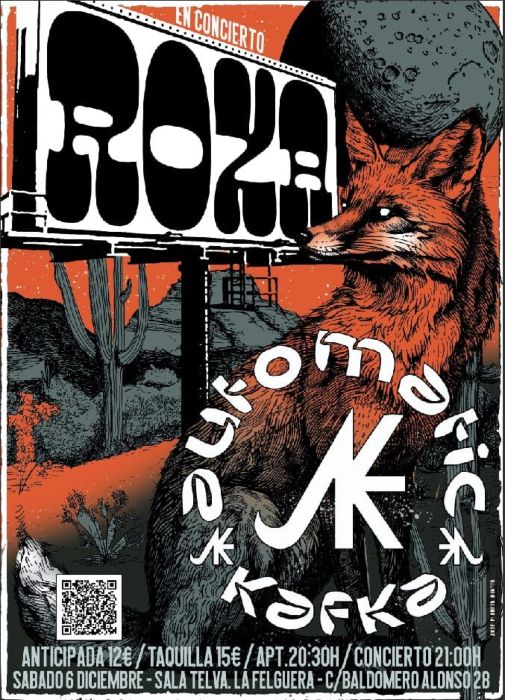 Nueva parada paraAutomatic Kafka en la presentación en vivo de su nuevo lanzamiento discográfico «Immortal«. En esta ocasión visita la Sala Telva langreana acompañado por Roza, formación liderada por Kike Suárez (Flying Padres, Goodbye Mr. Floyd, Desmontando a Jim) que presentará a su vez su última obra de estudio «Hotel Sonora«.