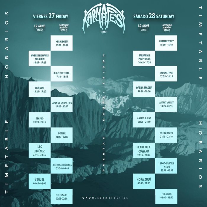 La décima entrega del Karma Metal Fest revela sus horarios oficiales. La segunda edición en el emblemático Prau de La Chalana que tendrá lugar los días 27 y 28 de septiembre dispondrá de 2 escenarios, “La Salve Stage” y “Senderos del Carbón Stage”, para un plantel formado por Frakture, Dawn Of Extinction, Her Anxiety, Teksuo, Debler Eternia, Selfaware, Hora Zulú, Astray Valley, Bolu2 Death, Brothers Till We Die, Blaze The Trail, Barbarian Prophecies, Retrace The Lines, Where The Waves Are Born, Chamako Wey, Monasthyr, As Life Burns, Leo Jiménez, Heart Of A Coward y Venues que contarán con el siguiente reparto de tiempos: