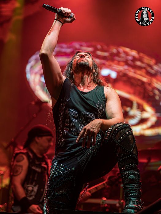 … que de pronto vira hacia uno de sus grandes clásicos, no otro que “Molinos De Viento”, fácilmente la más coreada de esta parte aún incipiente del set. El escenario se teñiría luego de rojo para recibir a la “Luna De Sangre”. Pero si hubo un corte que me agrado aquí fue “Diabulus In Música”, de aquella secuela del “Gaia” que la banda editara dos décadas atrás. El modo en que Rafa Blas la llevó a su propio terreno, el gran solo de un inspirado Salán o las voces, limpias ahora, que aportó Lavey. Mägo De Oz en su mejor versión. Blas nos habló entonces de la importancia de cuidar nuestro planeta. Era el turno de “La Venganza De Gaia”, uno de los cortes más extensos de la noche, y en el que la banda da lo mejor de sí en lo que a interpretación se refiere. El frontman de origen albaceteño pareció en su salsa aquí. Tanto a la hora de afrontar su línea de voz como en sus intentos de implicar a la gente. Y si bien las comparaciones con sus predecesores, en una y otra dirección, siempre serán algo odiosas, de justos es reconocer que parece haber caído de pie en el seno de la banda.