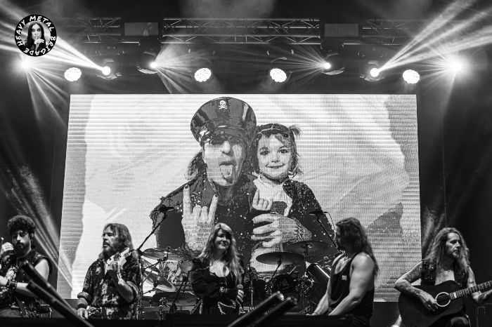 Lo primero que llama la atención (o no, según se mire) es precisamente lo ecléctico del público que, a eso de las doce y media, aguarda a la numerosa formación madrileña. El tipo de banda que son pero muy especialmente que fuese una cita que no requería pasar por caja, influye sobremanera. El caso es que sí, la banda fue puntual y es de agradecer. El electrónico de fondo hace las presentaciones. Vídeo introductorio a una “Alicia En El Metalverso” donde ya la banda suena de lo más redonda. En especial un Rafa Blas muy activo en lo gestual, bastante entero en lo vocal. El ex Nocturnia fue recibido con gran calor por los suyos. Xana Lavey (Celtian) haría las veces de Diva Satanica aquí, aportando su registro más grave a un buen arranque de show…