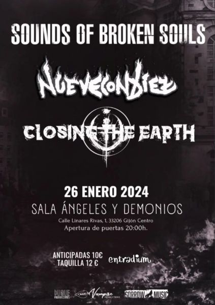El quinteto andaluz editaba el pasado mes de septiembre su primer larga duración continuación del EP «The Arrival» publicado en 2021 con el que llegaron a participar un año después en el Resurrection Fest. Por su parte Sounds Of Broken Souls presentará por primera vez en Asturias su último disco de estudio «Unwavering Voices«, del que tenéis cumplida reseña aquí, editado a través de Maldito Records en el 2022. En cambio Nuevecondiez hace una pausa en la composición de su próximo disco para repasar lo más granado de su discografía y presentar alguna de las nuevas canciones. Entrada anticipada 10€ disponible a través del siguiente enlace: https://entradium.com/events/sounds-of-broken-souls-nueve-con-diez-closing-the-earth