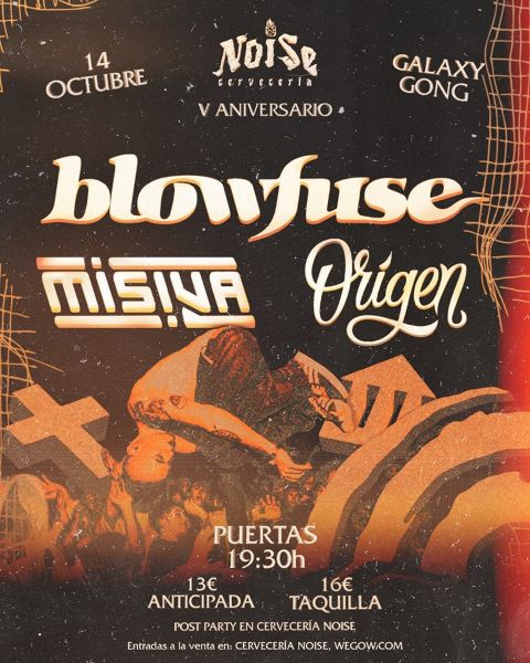 Origen retoma los escenarios tras una larga temporada de silencio para rendir homenaje también a los diez años de su primer EP “Inocencia”, por su parte Misiva presentará su nuevo trabajo «Mala Relixón» editado a finales del pasado año. Los también punk rock Blowfuse, toda una referencia estatal en el género, regresan a los escenarios asturianos para dejar de nuevo patente un estilo propio, mezclando la agresividad del hardcore punk, las pegadizas melodías del punk rock de los 90 y los poderosos riffs del rock clásico con letras ácidas y paranoicas. Entrada 13€ disponible a través del siguiente enlace a Wegow: https://www.wegow.com/es/compra/concierto-v-aniversario-cerveceria-noise-en-oviedo
