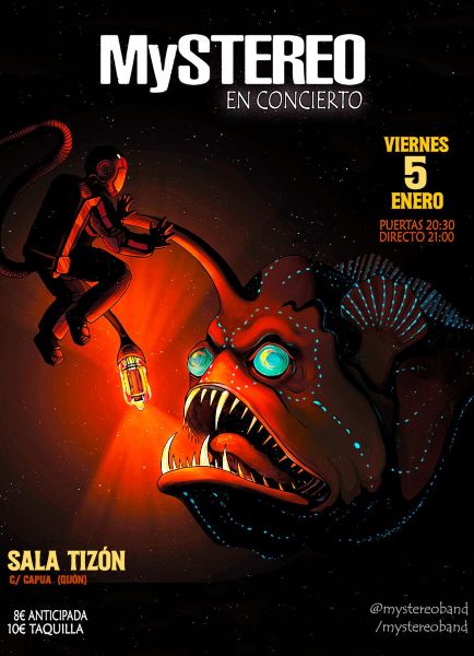 Pasados veinticinco minutos de las ocho abrieron el show los locales MyStereo. El concierto estaba previsto para las 20 horas pero los espectadores no fueron demasiado puntuales, si bien es cierto que la sala estaba bastante concurrida al momento de iniciar su descarga. Esta banda de gran trayectoria profesional inició su formación en Gijón en el año 2004, ganadores de numerosos certámenes de música en vivo a nivel local y nacional, han compartido escenario con artistas internacionales como los canadienses The Dudes o los finlandeses The Rasmus. En esta ocasión se presentaron con Adrián Muñiz (voz), Bruno Suárez (guitarra), ausente Alex Camargo (guitarra), completaron la alineación Sixto Santamaría (bajo) y Alex Fernández (batería).