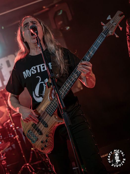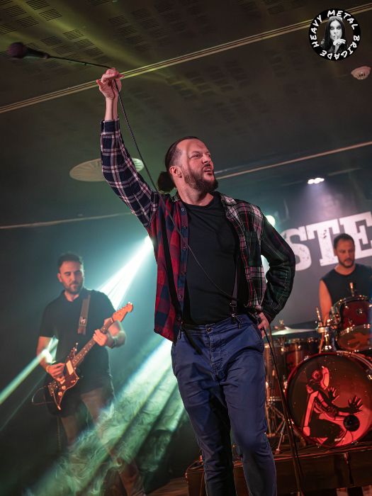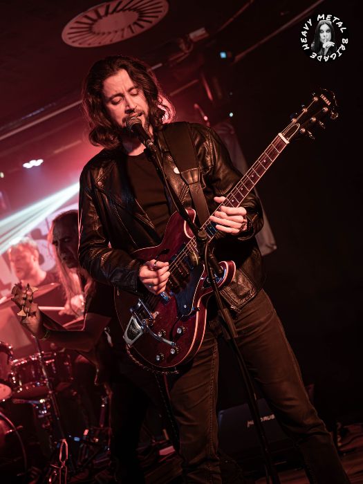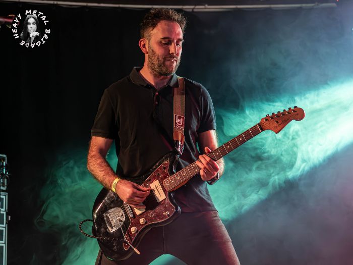 Turno para Sacavera, tras una breve pausa, se suben al escenario a las 21:45 para presentarnos su primer trabajo lanzado hace unos meses. Michell Ardura, a la guitarra y voces, Arturo “Turo” Fernández a los parches y Javier Garrido al bajo, este último luciendo una visera de su grupo y camiseta de Drunken Buddha, probablemente en honor al recientemente desaparecido Mario Herrero, teclista de la banda. El grupo formado en 2024 por músicos veteranos de la escena asturiana, a los que tuve oportunidad de ver en su debut en el Valliniello Sound Fest de 2024 (crónica), comenzó con un sonido contundente y mucha fuerza presentándonos “Invisible” tema dedicado a las personas que padecen de Alzhéimer y segundo corte de su EP homónimo, compuesto por cinco temas, los cuales nos interpretarían íntegramente a lo largo de la noche.