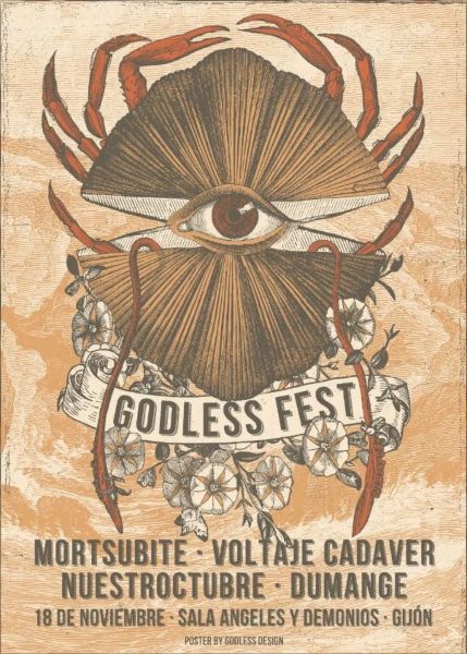Para conmemorar su 4º aniversario el estudio gráfico Godless Design congregará el viernes 18 de noviembre en la gijonesa Sala Ángeles y Demonios a los extremos burgaleses MortSubite, Voltaje Cadáver y su sludgy/doom metal desde Santander, el combo metalcore maño Nuestroctubre y como anfitriones el crust punk oscuro y metalizado de Dumange, formación compuesta por Senén, Marco, Nefta, Rubo y David, viejos conocidos de la escena musical astur.