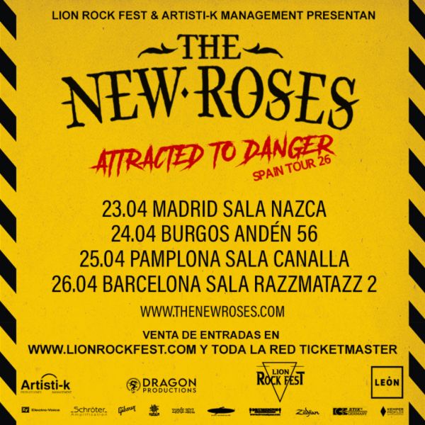 De la mano de Artistik Producciones y el Lion Rock Fest los hard rockeros alemanes The New Roses recalarán en nuestros escenarios el próximo 2026. Cuatro paradas (Madrid, Burgos, Pamplona y Barcelona) en el mes de abril dentro de la gira promocional de su última obra de estudio «Attracted To Danger» editada a través de Napalm Records el pasado 2024.