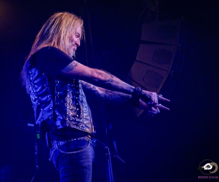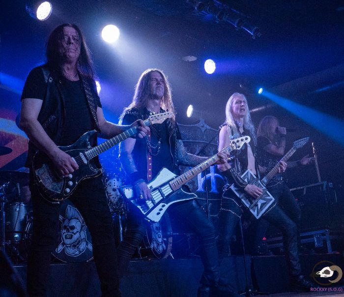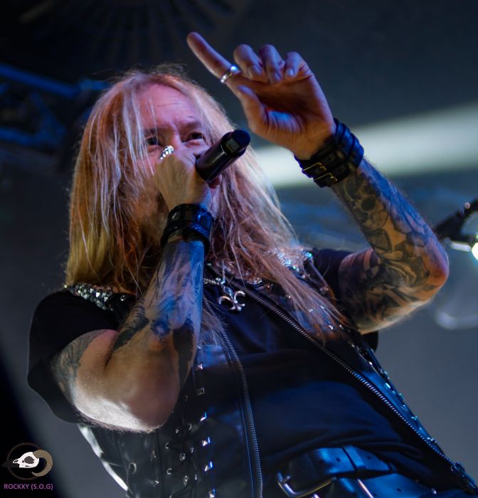 Las cortinas del escenario se cerraron y cuando se abrieron a las 9 de la noche los suecos Hammerfall ya estaban ahí junto a un enorme martillo y escudo abriendo el show con “Advenger Of Fallen”, primera canción de su último álbum. Ya llegó el trueno y con él la llamada de los guerreros, siguieron “Heeding The call” y “Any Means Necessary”. La banda para un segundo para tomar aliento y la sala se llena de vítores cálidos hacia ellos. Continuaron con “Hammer Of Dawn” y con el sonido del motor de una moto se inicia “Renegade” y toda la sala canta con ellos. La unión de la banda es más fuerte que el acero, Joacim y Oscar comparten sonrisas y están pendientes de que el público no cese de alzar los puños, Pontus y Fredrik tocan codo con codo al unísono como si fueran uno.