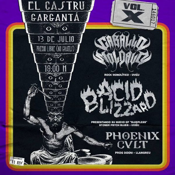 A partir de las 19 horas los gijoneses Phoenix Cvlt presentarán su ópera prima «La Profecía» publicada este mismo año al igual que la formación stoner ovetense Acid Blizzard y su Ep debut «Sleepless», por su parte Caballo Moldavo que se encuentran en muy cerca de editar su segundo trabajo discográfico volverán a dejar retazos del nuevo material. Con acceso libre, que no gratuito, el precio será marcado en un ejercicio de responsabilidad del espectador que decidirá la cantidad a aportar.