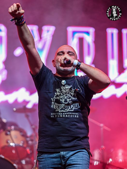 Un tramo final que recorre, del tirón, tres cortes que integrarán su futuro álbum de estudio “Waking The Fire”, siendo “This Distance Between Us” el primero de ellos, del que me agrada especialmente la escritura de su prólogo. Ángel, que se había deshecho ya de la chaqueta (bonita camiseta de Karma To Burn, por cierto), de nuevo tuvo problemas con el micrófono. La noche, desde luego, no estaba saliendo nada redonda para ellos. Pero como dije antes, espoleados por los inconvenientes, ofrecen su mejor cara aquí. A ratos el sonido iba y venía, en una sensación que me recordó a la terrible conjunción entre festival veraniego al aire libre y viento racheado. Curioso pues estábamos en un recinto cerrado a mediados de diciembre. El caso es que, sea como fuere, “Shadow Of Me” ofrece unas preciosas guitarras dobladas en el prólogo. Es un corte, oscilante entre la balada y el medio tiempo, que representa un registro en el que parecen particularmente cómodos. Cincuenta minutos exactos de una banda, nuevo disco en ciernes, que luchó de manera denodada contra los distintos problemas.
