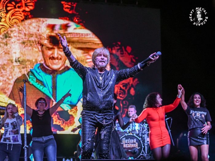 Todo tiene su fin, pero también su comienzo. Y el de Medina Azahara resulta en una cuenta atrás que repasa la vasta discografía de los cordobeses. Se extingue esa intro y la banda aparece en escena, Paco Ventura empieza soleando con los dientes y Manuel Martínez ofrece el micrófono a la gente para que ésta introduzca “Paseando Por La Mezquita”. Porque qué mejor que empezar el show de una gira despedida por el mismísimo comienzo. A esos Medina todavía iniciáticos, que bordeaban el progresivo setentero, confrontaron “Algo Nuevo”, dando un giro de casi 180 grados para ofrecer su cara más rotunda y vibrante. Manuel Ibáñez, teclista de la banda, parecía pasarlo en grande en la parte de atrás del escenario. Y justo delante de él, Paco Ventura dibujaba, tapping mediante, un solo lleno de clase. El siempre carismático Manuel Martínez, toda vez superados los percances de salud, ofreció una más que digna versión de sí mismo considerando la edad (74 años) y los mencionados problemas de salud.